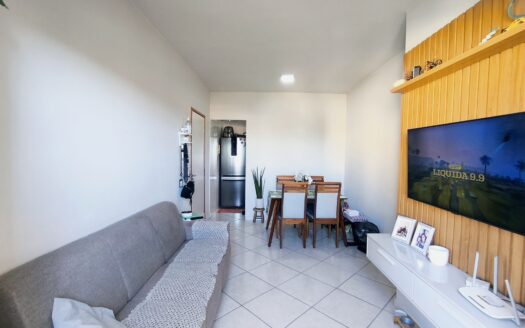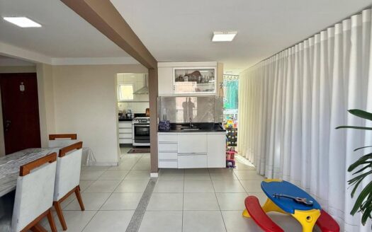 Apartamento com 3 quartos, banheiro, cozinha com armários em vidro, bancada e cooktop. Sala com varanda integrada,